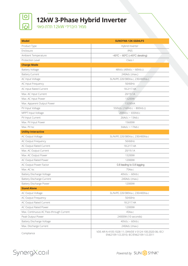 ממיר היברידי 12kW תלת-פאזי Sunsynk