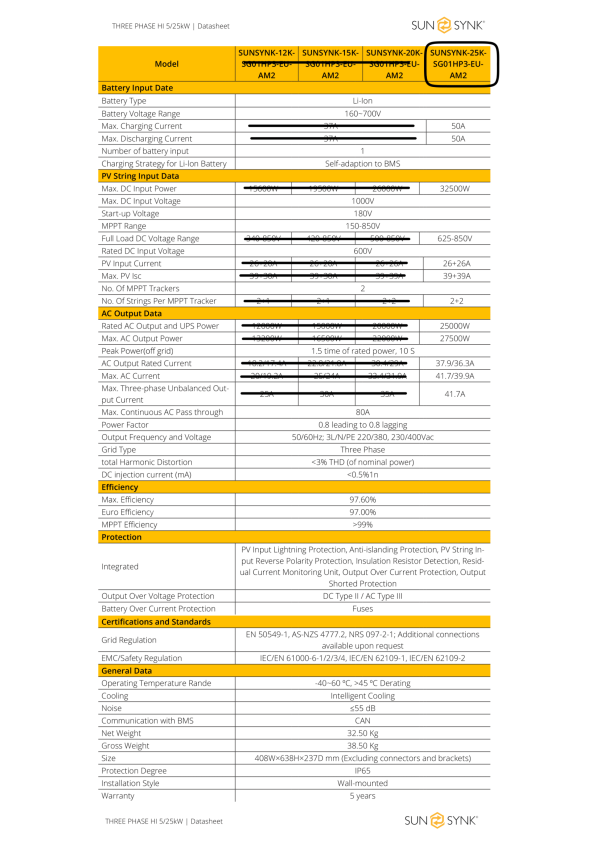 • Sunsynk 25kW 3-Phase Hybrid Inverter בנוי עבור פונקציונליות באמצעות שימוש ביכולות מתח גבוה, המאפשרות כוח מוגברת תוך שימוש בממיר קטן יותר וגמיש יותר