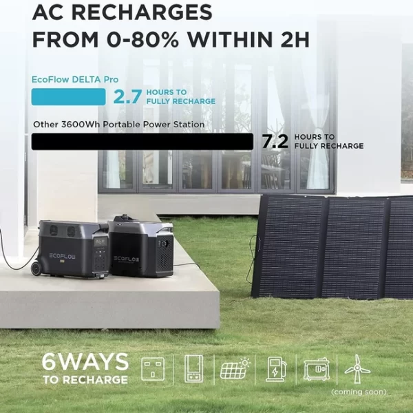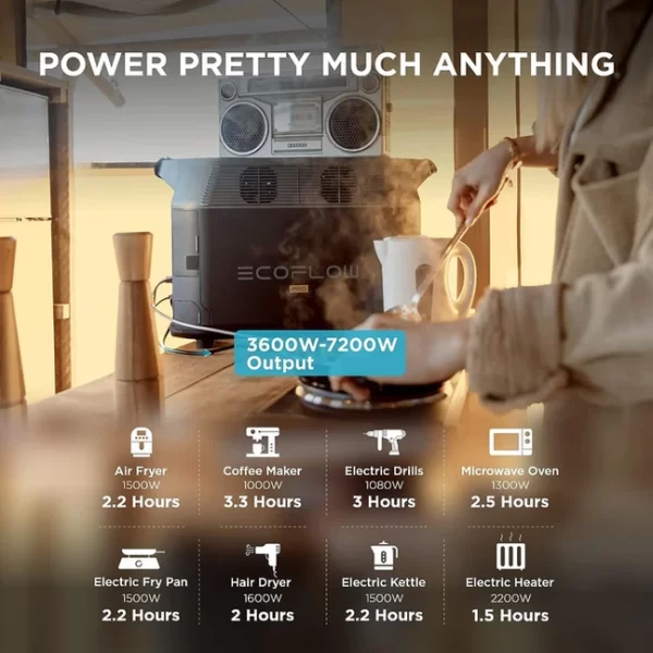 ניתן להפעיל כמעט כל דבר: DELTA Pro מובילה את התעשייה בכל הנוגע הספק AC. מערכת בעלת ממיר מתח חכם סינוס טהור 3600W שמסוגל להפעיל מכשירי חשמל כבדים כגון מייבשים, יחידות AC ועוד. צריך אפילו יותר כוח? ניתן לשרשר שתי יחידות יחד כדי להגיע להספק עצום של W 7200 באמצעות פאנל חכם.