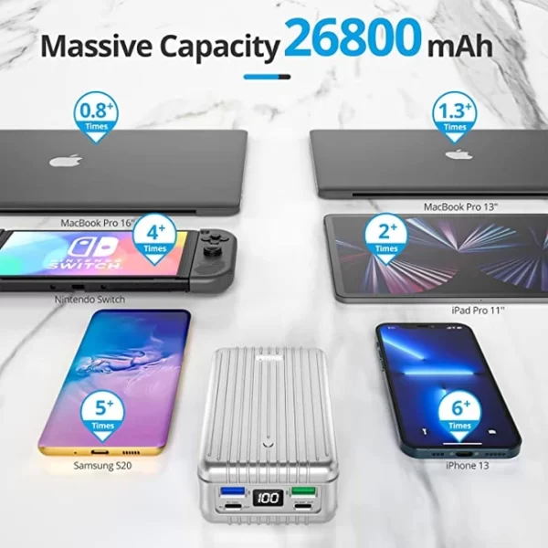 סוללה גדולה מובנית של 26800mAh מאפשרת לה להפעיל 4 מכשירים בו זמנית עם 4 יציאות USB-C. הוא יכול לטעון את האייפון 6+ פעמים ומכשירים אחרים מספר פעמים בממוצע של 7 ימים של שימוש בלתי מרוסן לכל טעינה.
